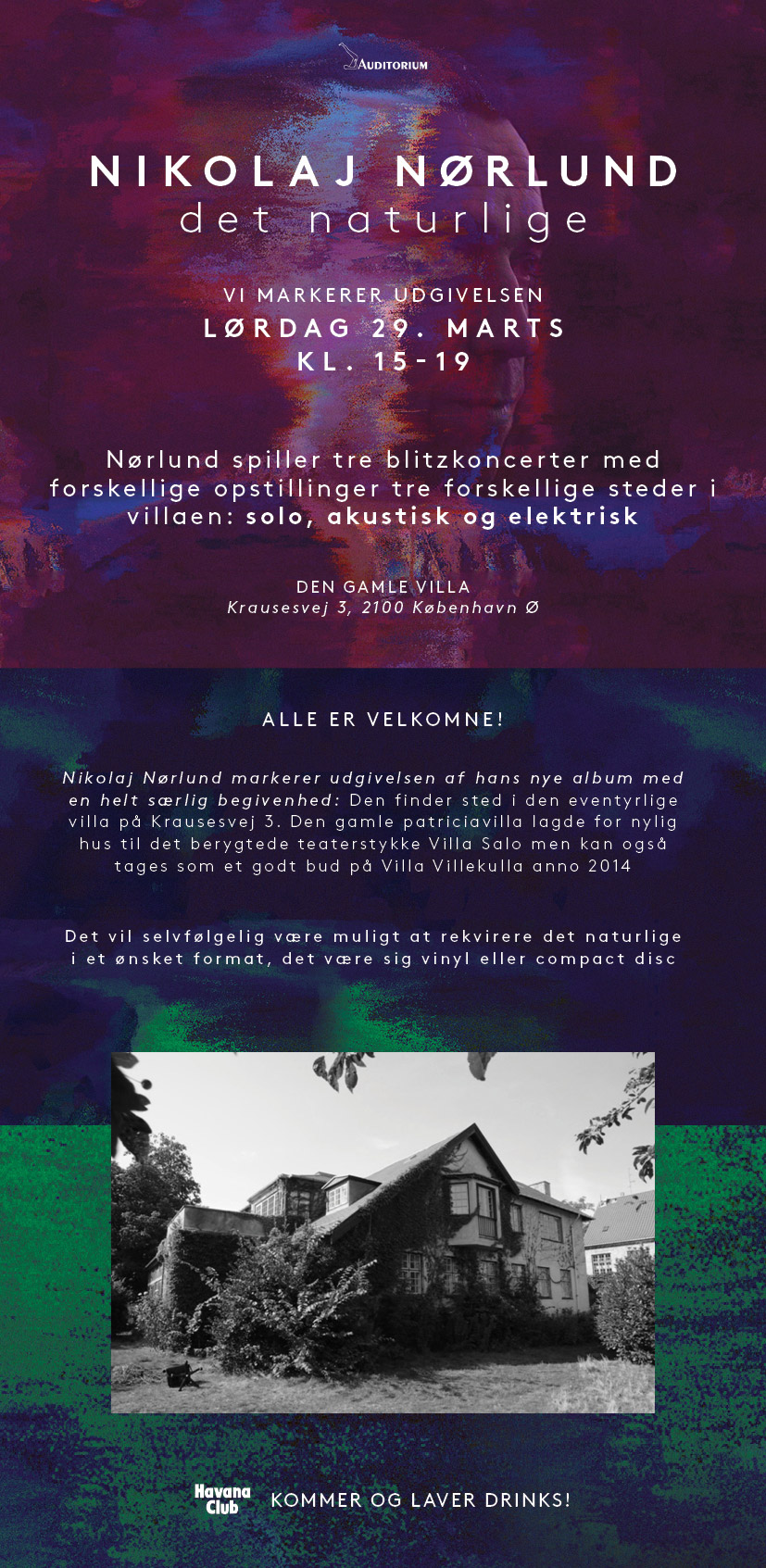 Udgivelsesfest for Nikolaj Nørlund *det naturlige*. Nikolaj Nørlund spillede tre blitzkoncerter med forskellige opstillinger: solo, akustisk og elektrisk.