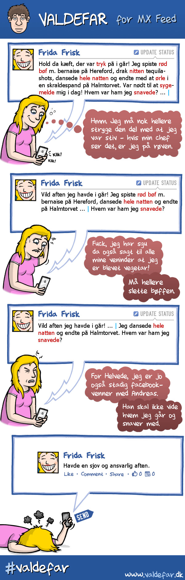 Kender du det med statusopdateringer og selvcensur? Admin11/03/201411/03/2014Tegneserier Indlæg navigation ForrigeNæste Valdefar: Gør du det samme, når du skriver en status? Læs flere striber på mx.dk og valdefar.dk. Vær sød at dele dette link på de sociale medier: Klik for at dele på Facebook(Åbner i et nyt vindue) Facebook Click to share on X(Åbner i et nyt vindue) X Klik for at dele på LinkedIn(Åbner i et nyt vindue) LinkedIn Klik for at dele på Tumblr(Åbner i et nyt vindue) Tumblr Click to share on Telegram(Åbner i et nyt vindue) Telegram Click to share on WhatsApp(Åbner i et nyt vindue) WhatsApp Like Henter... Relateret