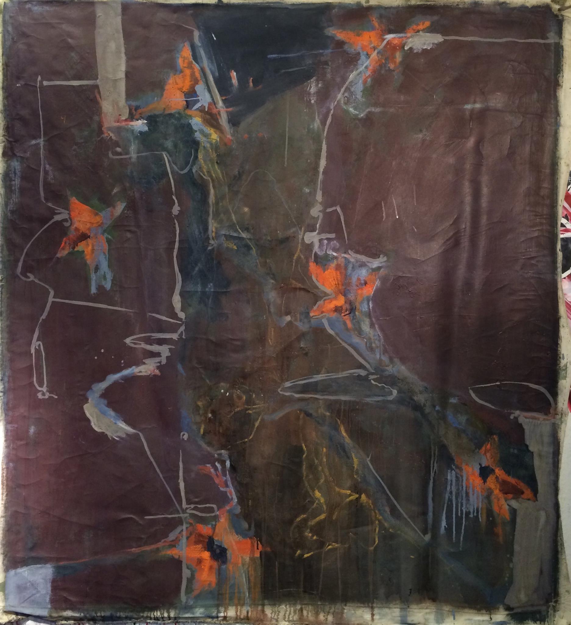 Painted at my studio in Paris 1987, this painting is probably a sole survivor of a roll of paintings brought home by train and led a tumultous existence until popping up a little more than a week ago in a dark, dirty attic – hidden away more than 20 years ago – and it shows..unfortunately. It’s called “Bodu-Flowers” whatever Bodu is, maybe this little creature at the bottom center…. I no longer recall. 152x137cm – sorry ‘bout the reflections…