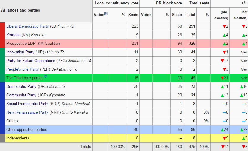 Oppositionspartiet DPJ gik faktisk 11 mandater frem til 73. Men da den samlede opposition kun kan mønstre 96 mandater er de langt fra at kunne genvinde den magt som de kortvarigt havde efter valget i 2009.