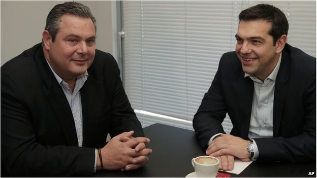 Meget overraskernede indgår det venstreorienterede Syriza et regeringssamarbejde med det højreorienterede ANEL. Samarbejdet går tilsyneladende ud på at fremstå så stærke så muligt i forhold til EU forhandlingerne. De fleste havde forventet et samarbejde med To Potami. DR har en god forklaring her.