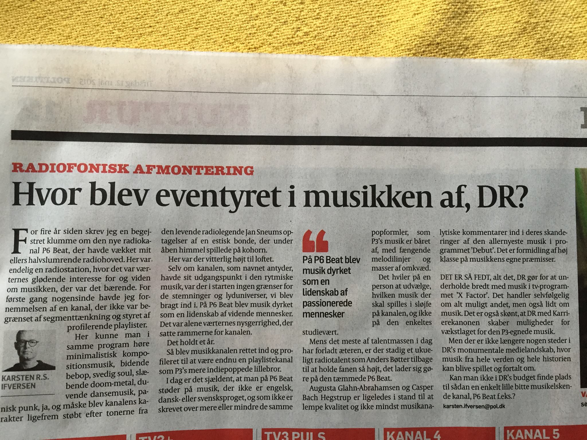 En stor del af den danske befolkning er jo slet ikke repræsenteret i radiofladen, nemlig alle dem med anden etnisk baggrund end dansk. Jeg har netop afsluttet et to-årigt projekt sammen med Dansk Rock Samråd – Jammin’ – som handlede om at etablere møder mellem danske musikere og herboende musikere med anden etnisk baggrund. Der er en kæmpe talentmasse af musikere som vi danskere aldrig hører om, og som kunne tage musikken helt nye steder hen. Tænk hvis DR også bakkede den slags musik op. Tænk hvad det ville gøre for forståelsen og integrationen.