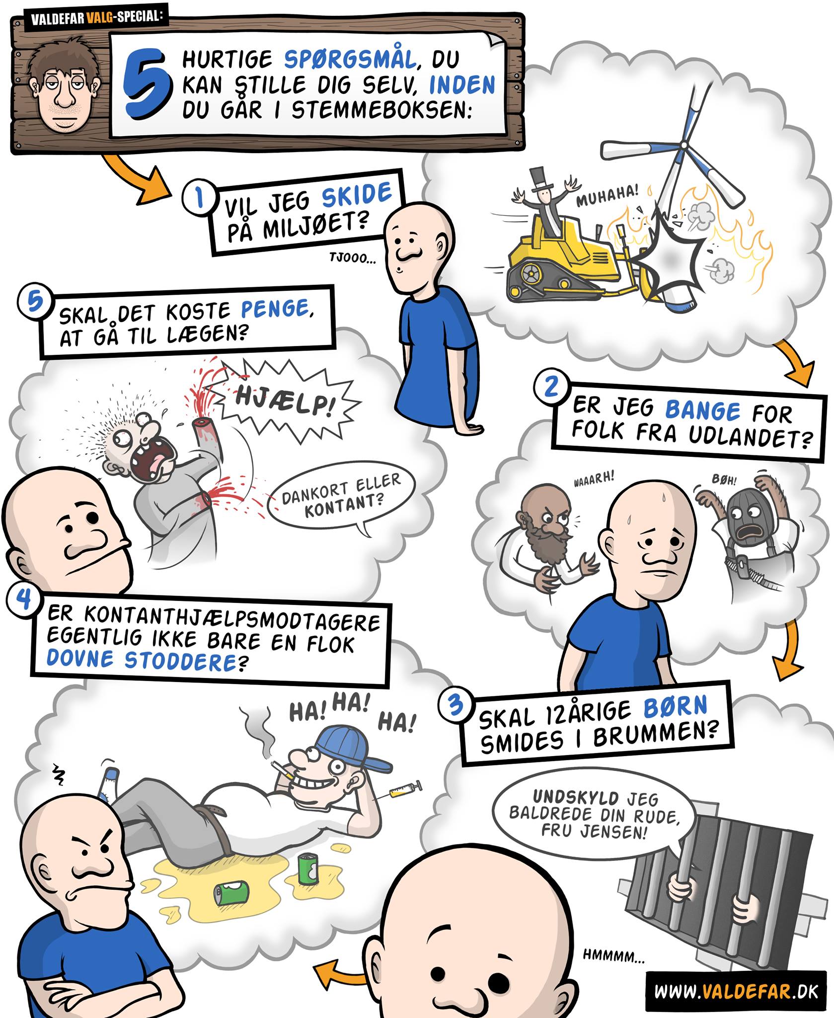 Valdefars Valg-special: 5 hurtige spørgsmål Admin06/17/2015Tegneserier Indlæg navigation ForrigeNæste Hav et godt valg! (stribe fra dagens udgave af Metroxpress). http://www.valdefar.dk/2015/06/valg15.html Vær sød at dele dette link på de sociale medier: Klik for at dele på Facebook(Åbner i et nyt vindue) Facebook Click to share on X(Åbner i et nyt vindue) X Klik for at dele på LinkedIn(Åbner i et nyt vindue) LinkedIn Klik for at dele på Tumblr(Åbner i et nyt vindue) Tumblr Click to share on Telegram(Åbner i et nyt vindue) Telegram Click to share on WhatsApp(Åbner i et nyt vindue) WhatsApp Like Henter... Relateret