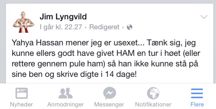 Jim Lyngvild skriver at han gerne vil røvpule mig så jeg ikke kan stå på mine ben i 14 dage. Det skyldes at jeg afviste ham. Hvis jeg var lige så skrøbelig som den typiske chefredaktør-dansker, så havde jeg læst en trussel og været bange for min røv og bedt PET om at beskytte mig igen. Hvis jeg, den arabiske-islamistiske-flygtninge-fremmedarbejder-udlændinge-indvandrer havde skrevet noget lignende, så havde jeg nok fået problemer med etablissementet og ordensmagten. Og hvis jeg endelig ville bolles i røven af højrefløjen, så var jeg nok allerede blevet det, Jim Lyngvilds ligesindede har nemlig stået i kø længe.