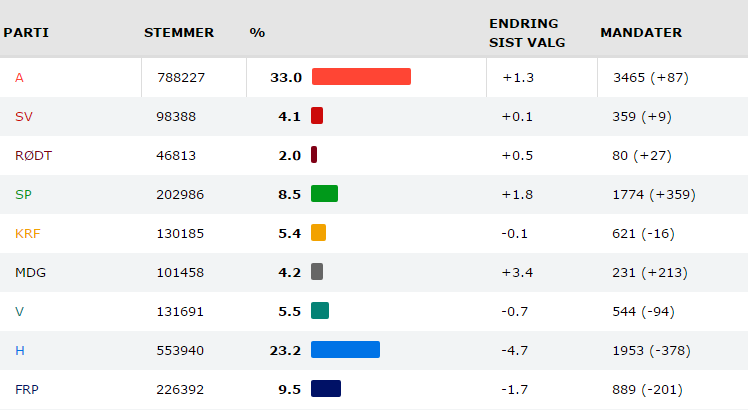 Kommune- og fylkevalget i Norge blev en sejr for rød blok og et kraftigt dyk til Højre og Fremskridtspartiet. Oslo skiftede flertal fra blå til rød, når man regner det nye Miljøparti med til de røde. Rødt, der nærmest svarer til Enhedslisten, fik 5 procent af stemmerne i Oslo og ikke mindre end 19,3 procent af stemmerne i Tromsø Centrum, hvor partiet er større end Højre.
