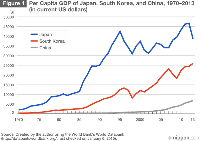 Disse to grafer fortæller flere historier om forholdet mellem Japan og Korea. På den første graf kan man tydeligt se det store boom i Japan i firserne, der siden er stagneret. I samme graf kan man se at Korea stille og roligt haler ind på Japan og i løbet af få år være på samme økonomiske niveau når det gælder BNP pr. indbygger.