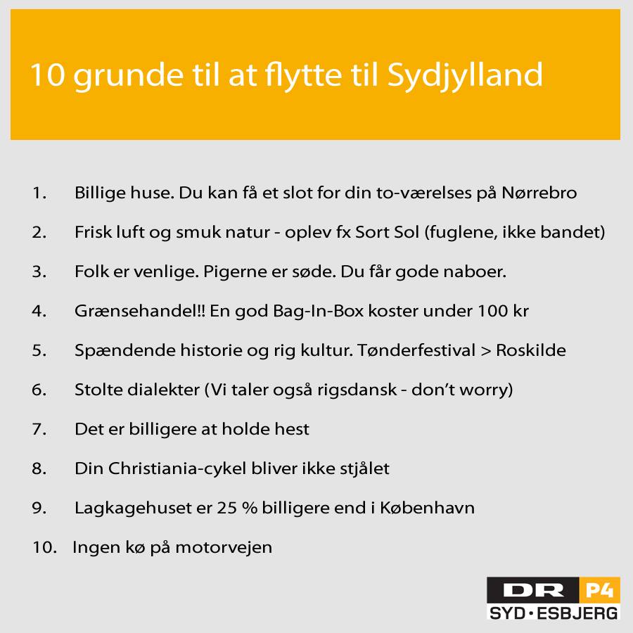 Kære københavnere. Vi forstår godt, I synes, det er hårdt at skulle flytte fra hovedstaden, når arbejdspladsen flytter. Derfor har vi og vores lyttere lavet en liste med 10 ting, som gør det okay at bo her i denne ende af landet. Velkommen – vi glæder os til at se jer!