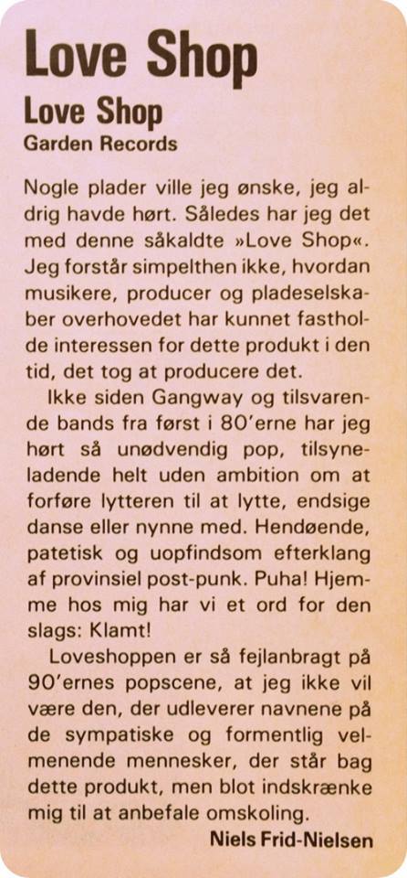 På fredag udkommer ‘Himmelflugt Og Højdeskræk’, forfatter Tommy Heisz’ med spænding imødesete bog om Love Shop, og præcis én uge senere udsendes albummet ‘Evergreen – Best of Love Shop’. At det overhovedet skulle kunne komme så vidt var der ikke meget der tydede på, da den senere DR-kulturjournalist Niels Frid Nielsen anmeldte Love Shop’s debutalbum i magasinet Levende Billeder i foråret 1990…