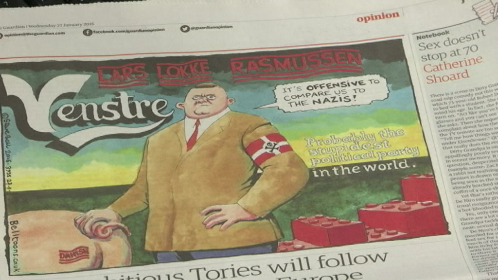 Den britiske avis The Guardians satire-tegninger, der bl.a. skildrer statsminister Lars Løkke Rasmussen med et rødt armbind, vækker forargelse på Christiansborg.