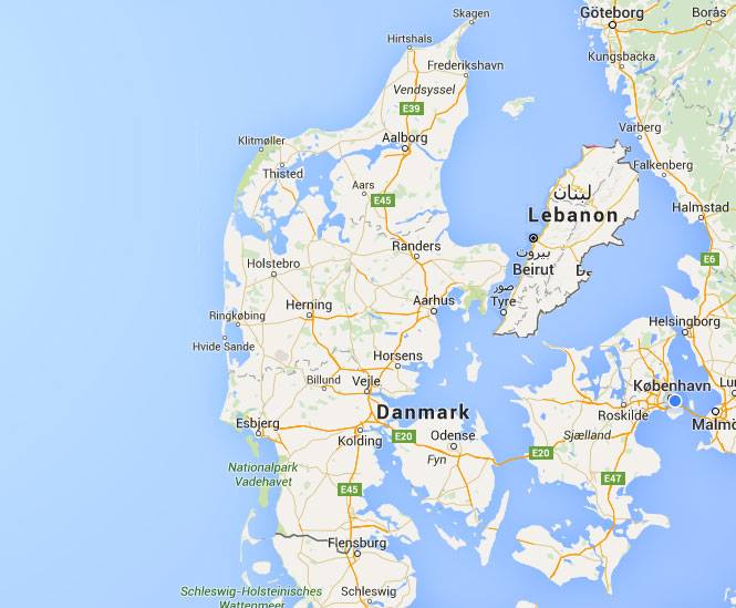 Her er et billede af Danmark, hvor jeg lige har smidt Libanon ud i Skagerrak – det er der nemlig så fint plads til, da Libanon er et ganske lille land (undskyld Anholt, men jeg er ikke grafiker og et eller andet sted skulle Libanon jo ligge). I Libanon er der lige nu lidt over 2.000.000 syriske flygtninge. I Danmark er der under 15.000. Danmark mener ikke at have plads til flere. Til gengæld mener vi, flygtningene i højere grad skal hjælpes i nærområderne – som eksempelvis Syriens naboland, Libanon. Jeg lader lige billedet stå et øjeblik.