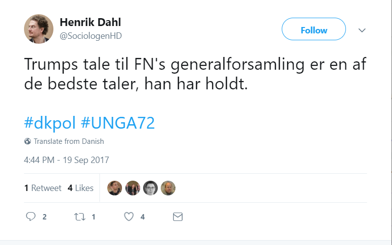 Trumps militarisme og krigstrusler i FN-talen har vakt skræk og rædsel i hele verden. Men der er dog to, der er begejstrede og siger, at det er den bedste tale, de har hørt. Det er Netanyahu. Og Henrik Dahl.