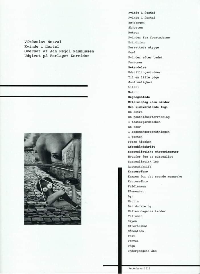 Forlaget Korridor står for en af årets absolutte sensationer, nemlig udgivelsen af ikke én, men to bøger fra den tjekkiske surrealisme, Konstantin Biebl: ”Den nye Ikaros” og Vítězslav Nezval: ”Kvinde i flertal”, begge oversat til dansk af Jan Nejdl Rasmussen. Jeg kan ikke vurdere oversættelsen i forhold til originalsproget, men digtene fungerer lydefrit på dansk. Jeg har ventet på disse bøger med spænding fra det øjeblik, jeg hørte, at de var på vej. Og det er en stor tilfredsstillelse at sidde med dem i hånden og simpelt hen bare læse dem! Det er sjældent, at vi får surrealistiske hovedværker på dansk – og her taler vi om hele værker, ikke blot om enkeltdigte i antologier o.lign. Og det er ikke mindre sjældent, at vi får indblik i, at surrealismen var andet end den franske surrealisme (eller den internationale surrealisme, som den udfoldede sig i Paris). Ikke fordi vi ikke vidste, at den fandtes, men at få poesien præsenteret som den poesi, den er, det er det, der er det prægtige. Biebls bog er et enkelt digt i fire dele, stort i anlæg, slyngende om sig med billedsyner, en slags sørgesang over Første Verdenskrig, hvor de tungeste kanoner er ugler, der tuder; det er ved Verdun, ”hvor de levende ligger / hvor de døde står / hvor de døde franskmænd står / hvor de døde tyskere står”. De levende er døde, og de døde er levende i dette helvede. Men så snævert er digtet ikke, det breder sig ud i mange retninger, også frem i tiden og ud af tiden, inden det slutter med disse linjer: ”Jeg elsker forandring / jeg flyder på alle havene”. Endnu vildere – og efter min vurdering med en større poetisk prægnans – er Nezvals store udspil, der over knap 200 sider rummer såvel digte som et helt skuespil. Digtene er overvældende. Et af dem, ”Højsangen”, kendte vi i forvejen fra Viola Wandall-Holm og Ivan Malinovskis udvalg ”Ti digte” (Arena, 1960). (Et af digtene fra ”Ti digte”, ”Akrobaten”, findes også i ”aktuel surrealisme”, redigeret af Finn Hermann, Arena, 1966, og begge digtere, både Biebl og Nezval, er repræsenteret i ”Tvivlens plageaand”, udvalgt af Claude Serbanne, på dansk ved Steen Colding, Forlaget C. Walter Thomsen Jun., 1947). (”Højsangen” kan også læses i ”LyrikBogen”, Munksgaard, 1992). Men her har vi altså en hel bog, som oven i købet er sammensat af forskellige udtryk, fordelt over syv afsnit. Der er enkeltstående digte af stor skønhed, suiter af digte, dagbogsnotater (drømmereferater) og også et afsnit, der i digtform forklarer, hvorfor digteren er surrealist. (Skuespillet må jeg indrømme, at jeg i denne omgang sprang over, det må blive en anden gang). Nezval var med til at grundlægge bevægelsen Poetismen (i 1924), og i 1934 efter kontakt (og venskab) med André Breton og Paul Eluard tilsluttede den tjekkoslovakiske gruppe sig den surrealistiske bevægelse. Nezval forlod surrealismen fire år senere, ikke uden påvirkning af den problemstilling, der også prægede opgørene og konflikterne i Paris, nemlig forholdet til (Sovjet)kommunismen. Nogle surrealister meldte sig ind i kommunistpartiet, andre ikke. Eksklusioner fandt sted på grund af denne splittelse. Nezval er nærmest eksemplarisk, hvad angår dette dilemma, individ eller samfund, surrealismen som individuel udfoldelse – et dyk i sindet – eller som revolutionær bevægelse i organiseret form. Han valgte det sidste på bekostning af det første, men i ”Kvinde i flertal” er han stadig surrealist, ikke blot erklæret, men praktiserende og erklærende. Nogle linjer i digtet ”Duel” får programmatisk karakter: ”Med lukkede øjne ser han valmuen / Der velsigner hans overskæg som flammen / Fra det aldrig tilfredsstillede begær”. Det erotiske er i sagens natur et gennemgående motiv – eller mere end et motiv, en slags digtets begrundelse og dybere mening. Drømmen, kvinden, besunget i billeder fra en ubevidsthedsautomatisme, i forening med dagklar bevidsthed = klassisk surrealisme! Det er meget givende at læse denne bog, bekræftende og forbløffende, svimlende, ja, sindsudvidende. Bogen tilbyder et historisk tilbageblik, men udgør samtidig sit eget tidløse nu. Uanset hvad der måtte udkomme i løbet af efteråret, hører disse to bøger til blandt årets vigtigste bøger, tak til Jan Nejdl Rasmussen, og tak til forlaget Korridor. Trivia: Sidst vi blev mindet om Vítězslav Nezval i dansk litteratur, var i Theresa Salomonsens digtsamling ”Kast himlen i havet” (Korridor, 2017/2018), hvor et af digtene i midterdelen hedder ”Til Vítězslav Nezval”.
