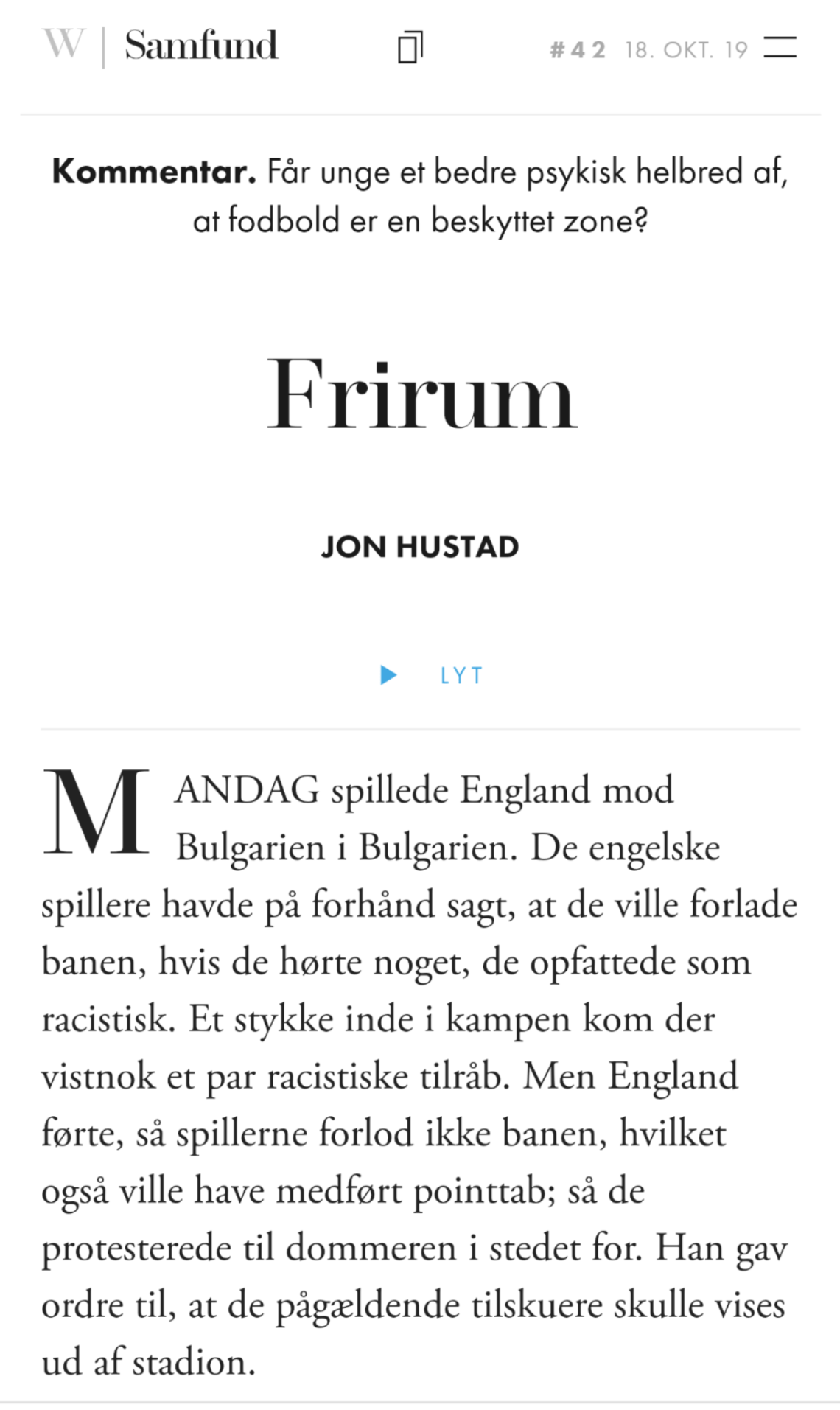 Nu er Hustad på banen igen. Denne gang i et glødende forsvar for racisme og homofobi på fodboldstadioner. Hans teser, som gemmer sig bag avisens betalingsmur, går ud på, at det ikke nytter at beskytte mindretal fra den barske virkelighed og – nok så interessant – at mennesker (mænd?) alle rummer et vist omfang af ondskab, som vi skal have afløb for, og så er det bedre, at det sker under de forholdsvis kontrollerede omgivelser, som en fodboldkamp tilbyder.