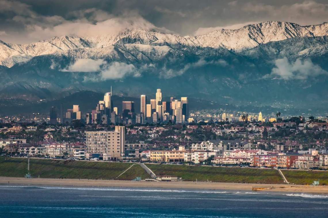For at få størrelsesforholdene på plads er der cirka 30 km fra kystlinjen i forgrunden til klyngen af højhuse i Los Angeles Downtown i midten af billedet.