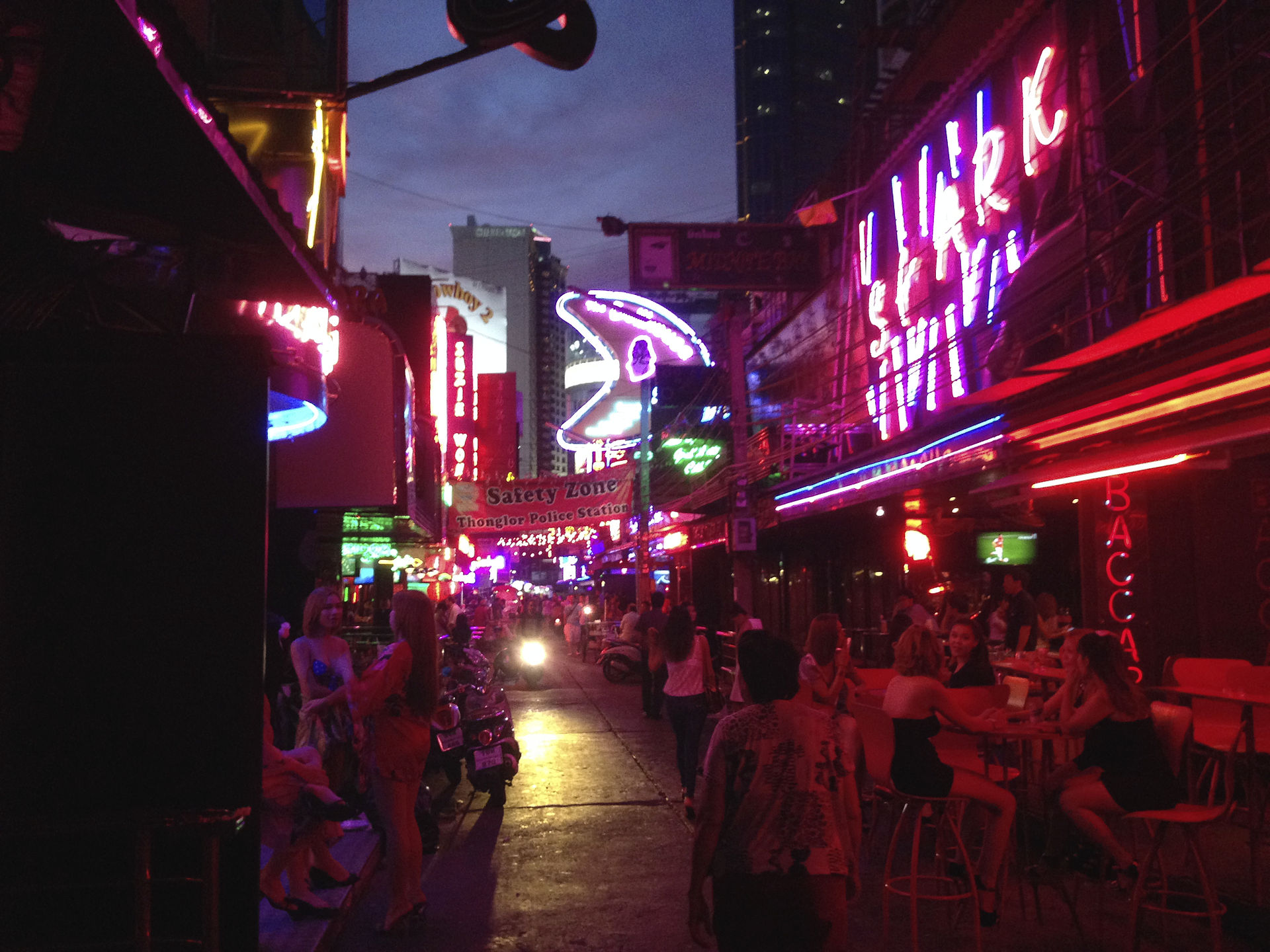 På den godt 400 meter lange gade findes der nærmest kun go-go barer. Det er et kødmarked, og kødet er unge og yngre Thai kvinder. Og mænd, der gerne vil være kvinder.