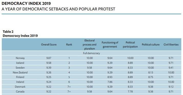 The Economist laver hvert år et Democracy Index, en ranking over landes demokratistatus. I 2019 ligger Danmark efter vores nabolande – især fordi vi er svage på politisk deltagelse.
