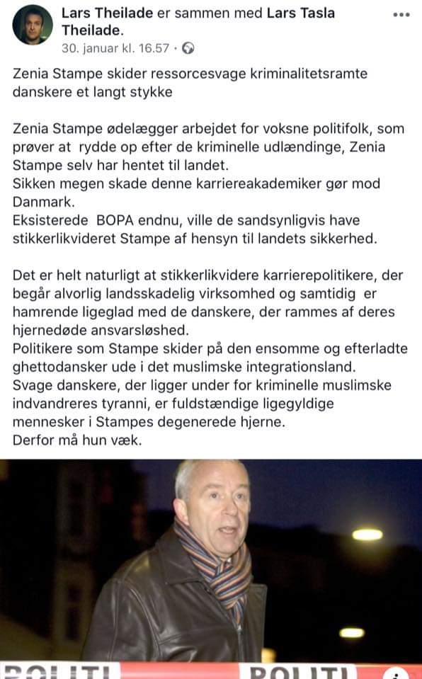 Jeg har brugt min frokostpause på at sidde og stirre opgivende på denne opfordring til at likvidere mig. Manden bag opdateringen er en af Rasmus Paludans mest loyale støtter. I et læserbrev i Ekstra Bladet har han beskrevet sig selv som en af Rasmus Paludans “lakajer” og fortalt, at han har deltaget i Paludans demonstrationer fra start og stadig gør det.