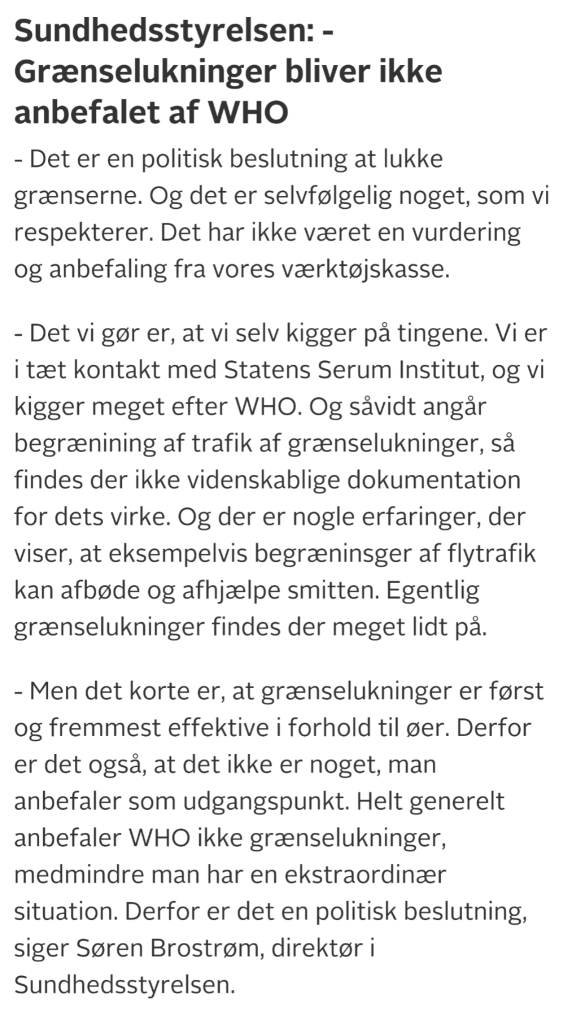 Regeringens grænselukning er ikke en sundhedsfaglig beslutning Admin03/14/202003/14/2020Politik Indlæg navigation ForrigeNæste Dagbladet Information spurgte til grænselukningen. TV2 har udsendt svaret på tv2.dk. Vær sød at dele dette link på de sociale medier: Del på Facebook(Åbner i et nyt vindue) Facebook Share on X(Åbner i et nyt vindue) X Share on LinkedIn(Åbner i et nyt vindue) LinkedIn Del på Tumblr(Åbner i et nyt vindue) Tumblr Share on Telegram(Åbner i et nyt vindue) Telegram Share on WhatsApp(Åbner i et nyt vindue) WhatsApp Like Henter... Relateret