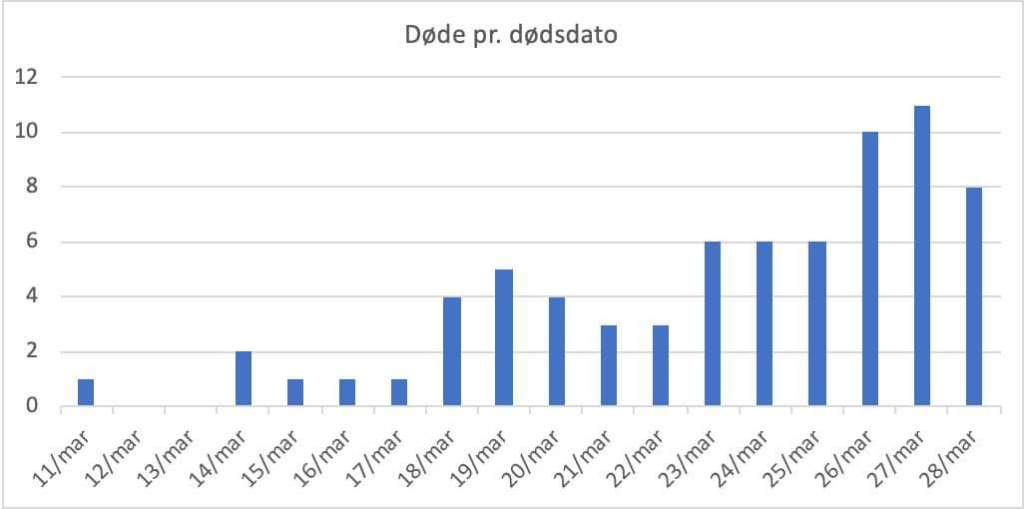 På denne tid af året dør der normalt ca. 150 personer om dagen. De seneste dages niveau for dødsfald med COVID-19 svarer altså til ca. 6% af det totale antal dødsfald.