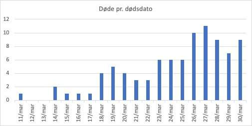 Der døde 9 personer i går mod 7 i forgårs og 9 dagen før. Som ventet er der sket en lille opjustering af dødstallene for lørdag og søndag. Det samlede dødstal er nu oppe på 90 mod 77 ved opgørelsen i går.