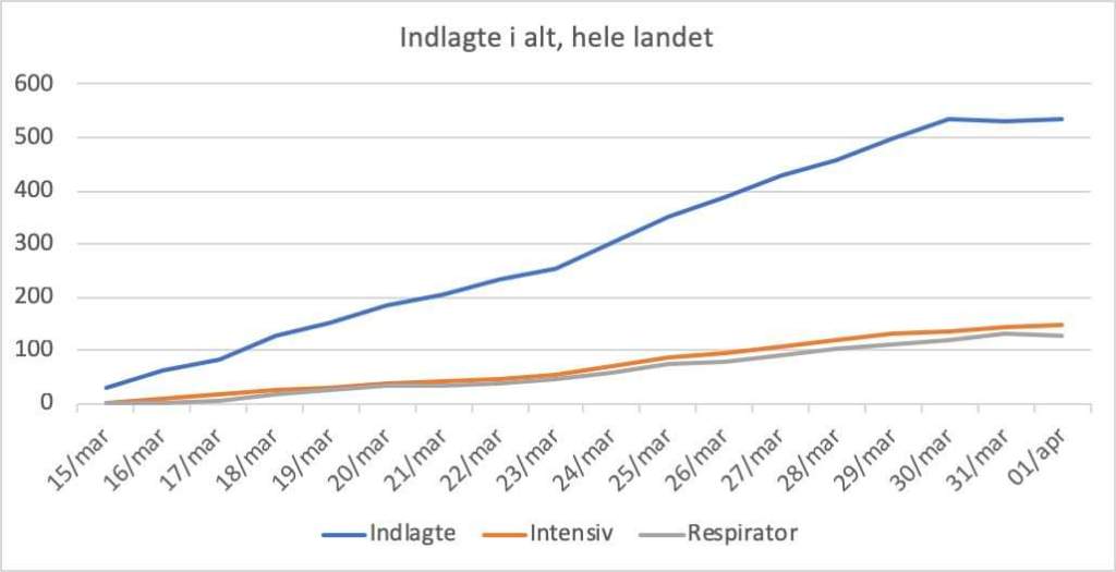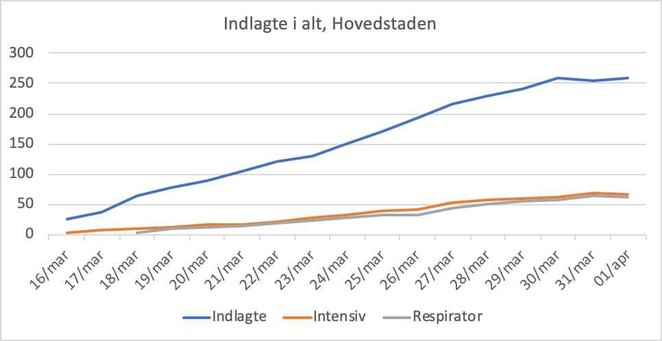 Det samlede billede i går og i dag er altså en pludselig udfladning af alle indlæggelseskurverne efter to uger med nærmest lineær vækst.