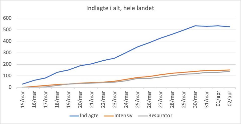 Antal indlagte er faldet med 10 siden i går til 525. Så udfladningen har bidt sig fast på tredje døgn og er måske begyndt at falde.