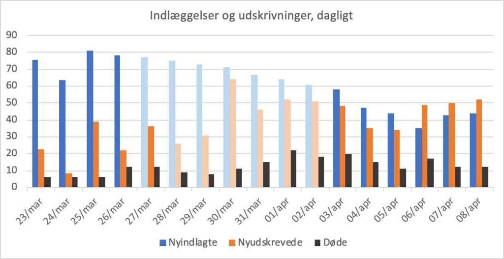 Der blev indlagt 44 patienter i går og udskrevet 52. Det er stort set som i forgårs, og det var tredje dag i træk med flere udskrivelser end indlæggelser.