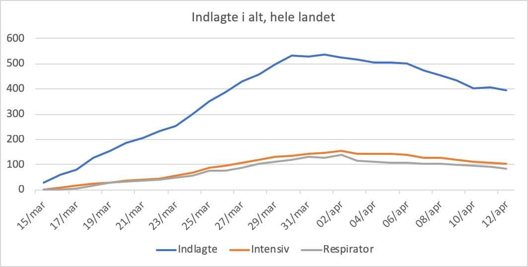 Antal indlagte er faldet med 12 til 396. Dermed er der nu under 400 indlagte for første gang siden 26. marts, altså for to en halv uge siden.