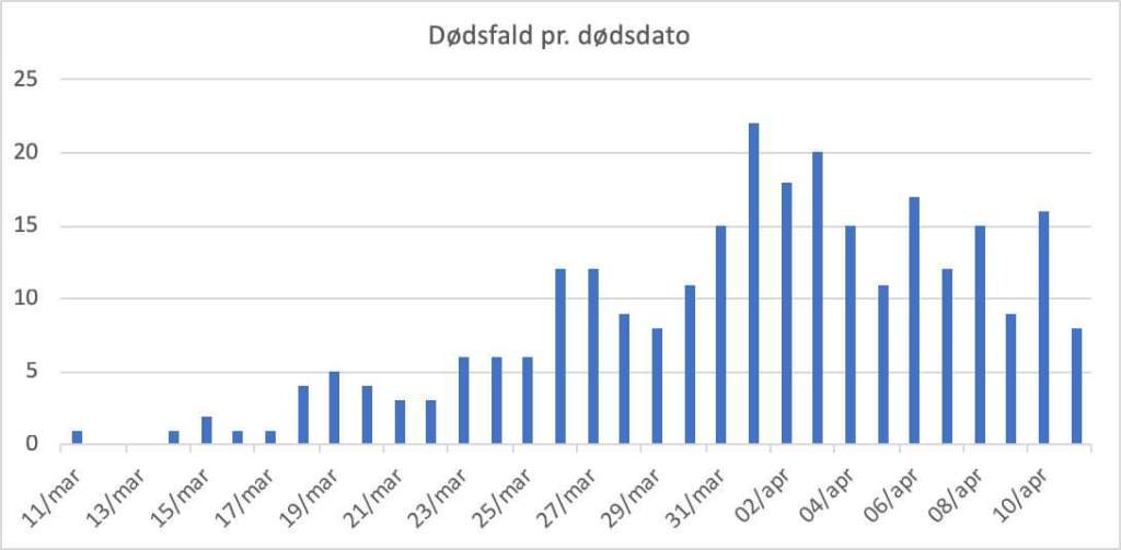 Der i alt 273 døde (13 flere end det samlede tal i går). Der er registreret 8 døde i går mod 16 i forgårs. Det daglige dødstallet har svinget omkring 15 den seneste uge eller to med en svagt faldende tendens.