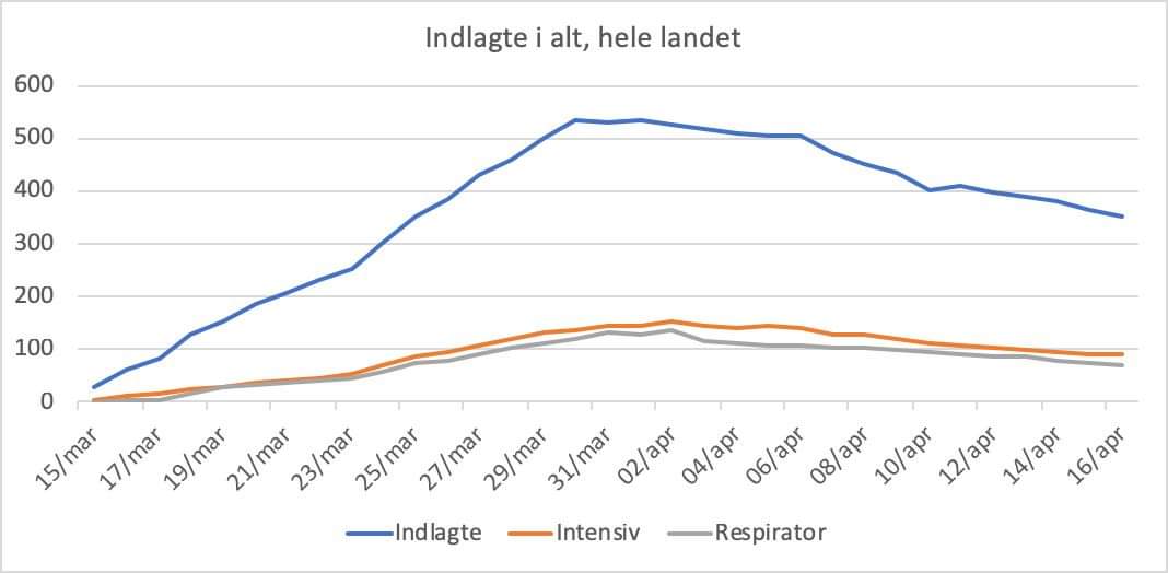 Der blev indlagt 32 patienter i går. Bort set fra et dyk den 13. april har den tilgangen af nye patienter ligget på omkring 30 om dagen i den seneste uges tid. Antal udskrevne om dagen er lidt højere (35 i går).