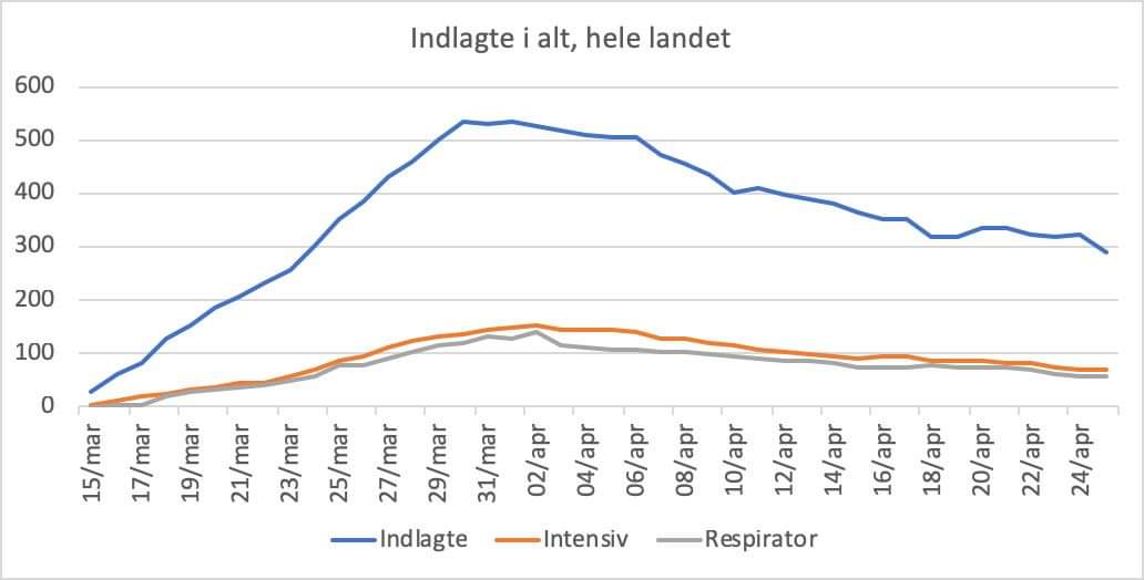 Indlagte er faldet med 30(!) siden i går til nu 290. Det er et fald på over 9% og første gang siden 23. marts, at der er under 300 indlagte.