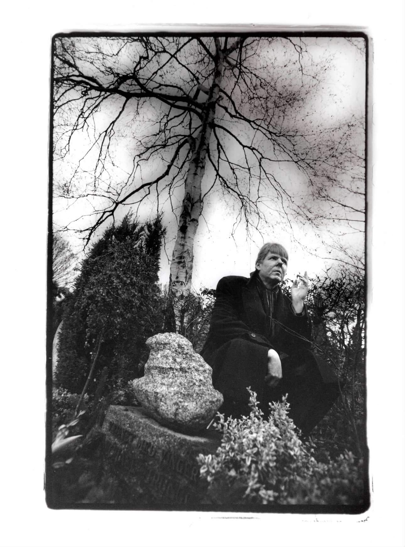 F.P. Jac skrev i 1998 radiospillet ”Som om at vi ikke var plot nok” om forholdet mellem Jac og Michael Strunge eller Mikker, som han hedder i stykket. På en forunderlig måde fremstilles det nære, men også komplicerede venskab fra den tidlige Hvidovretid til senere møder i København og i diverse hvide rum (d.s.s. hospitalsstuer). Stykket kan på én gang læses som et digt og som en ganske præcis dokumentarisme (i poetisk sprog, uanset hvem der taler). Det usædvanlige stykke blev opført og sendt i Radioteateret i 1998 og fik samme år Dansk Blindesamfunds Radiospilspris, ligesom det udkom i bogform. [Senere genoptrykt i ”Erindringerne” (2014)]. På fotografiet ses Jac netop i 1998 siddende ved Michael Strunges grav på Assistens Kirkegård i København. Trivia: På Strunges gravsten står: ”Væbnet med vinger”, jf. hans sidste digtsamling i eget navn så at sige (”Verdenssøn” udkom som bekendt under navnet Simon Lack) (hhv. 1984 og 1985). (Foto: Henrik Dithmer)