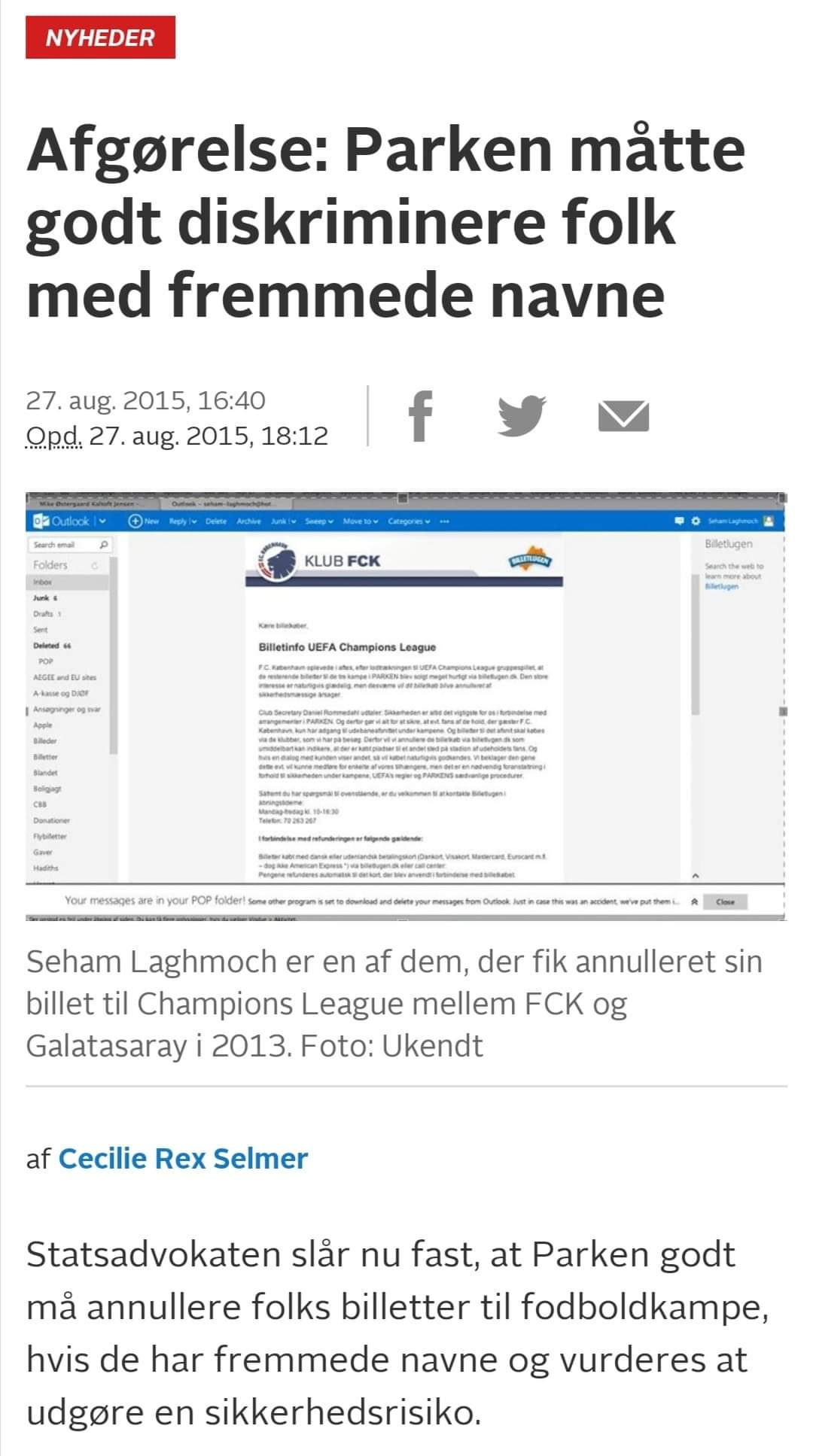 - For år tilbage fik jeg annulleret mine billetter til Champions League, fordi man mente at mit “fremmedklingende navn, var til fare for sikkerheden i Parken.” Jeg lagde sag an mod dem, men tabte i retssystemet igen. Ligebehandlingsnævnet traf efterfølgende en stik modsat afgørelse.