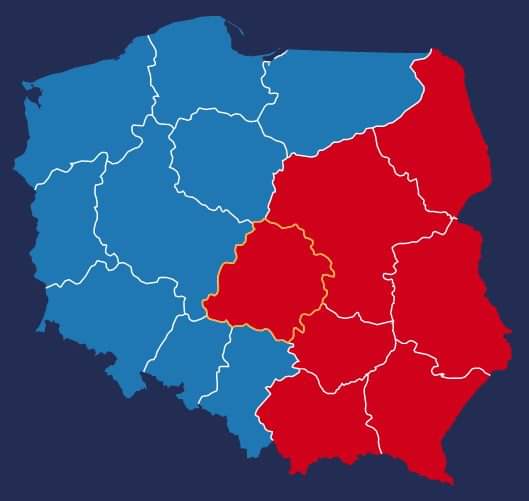 Det er interessant at se, hvordan stemmerne fordelte sig. De røde områder på kortet herunder blev vundet meget klart af Duda, mens hans modstander blev en ligeså klar sejrherre i de blå områder.