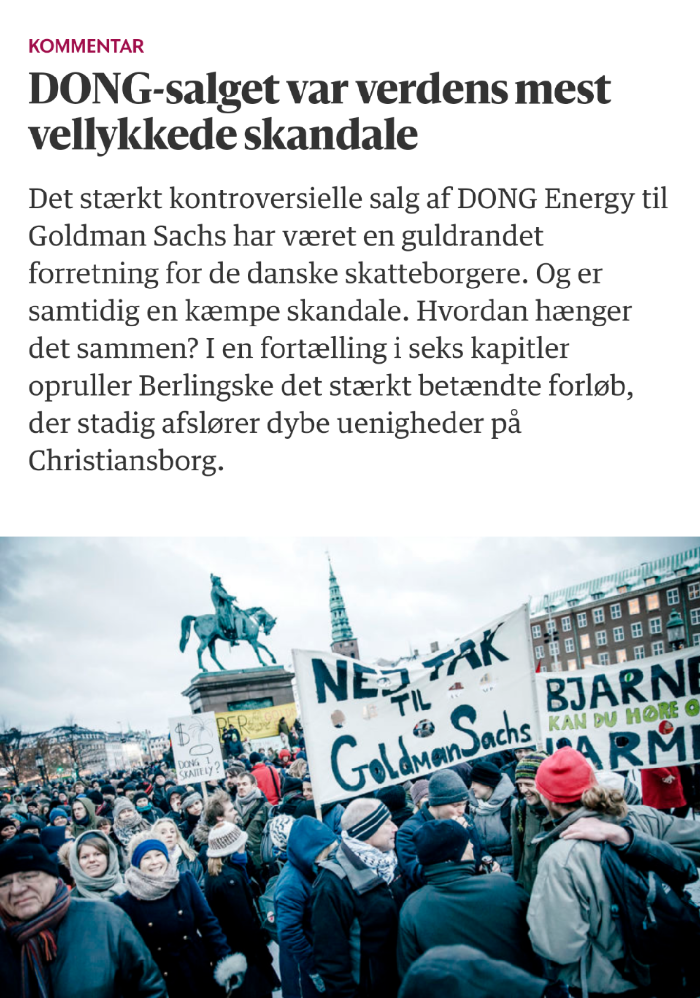 Berlingske Tidende skriver på forsiden i dag, at salget af DONG-aktier til Goldman Sachs blev den bedste forretning for staten i nyere tid. Forsiden prydes samtidig med en billede af den hovedansvarlige for salget, daværende finansminister Bjarne Corydon. DONG, nu Ørsted er en stor succes, men det var lagt på skinner før Goldman Sachs. Det havde været mere korrekt for Berlingeren at skrive, at det var en af de bedste forretninger for Goldman Sachs. De købte for 8 milliarder kr. aktier og uden at røre en finger solgte de dem igen og kunne efter 3 år notere sig en salgspris på over 20 mia. kr. og dermed en fortjeneste på over 12 mia. kr. En rente på 150 % på 3 år for at låne penge til et statsligt selskab. Det er da godt gået for dem og man skal vist hedde Corydon for at kalde det en god forretning for staten. Eller som den nu afgående chef for Ørsted, Henrik Poulsen siger til Berlingske i dag: ”Man kan selvfølgelig indvende, at staten også kunne have hjemtaget Goldman Sachs’ fortjeneste, forudsat at der havde været politisk flertal for, at skulle komme med egenkapitalen.” Men det overvejede S, R, SF og de borgerlige ikke. Derfor fik Goldman Sachs 12 milliarder kr. fordi staten ikke ville hjælpe statens eget selskab med et kortvarigt behov for kapital.