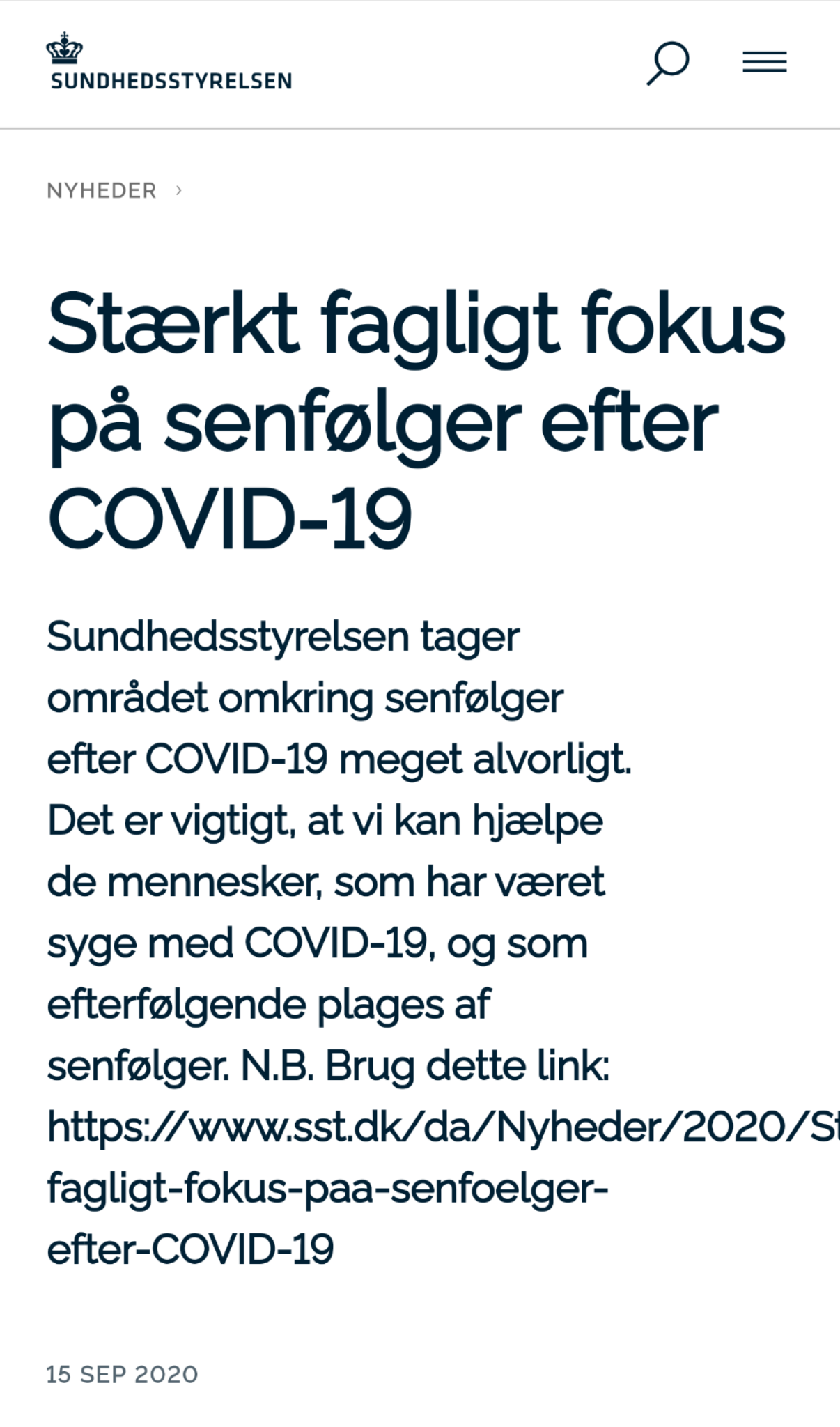 Derfor er det vigtigt at dele al den viden, vi har om coronavirus. Vi ved endnu ikke, hvor lang tid senfølgerne efter overstået sygdom vil være der hos den enkelte. Men vi ved, at det er en alvorlig konsekvens af virussygdom, som vi ikke endnu kender det præcise antal for i Danmark, men internationalt anslår man, at mellem 5-10 % kan få senfølger efter at have haft coronavirus.