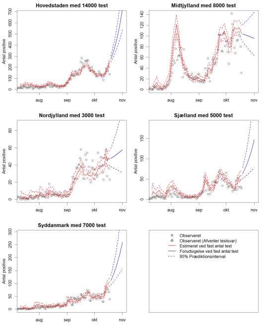 Jeg nævnte på pressemødet, at Seruminstituttets ekspertgruppe for matematisk modellering har lavet prognoser for udviklingen af smitte fordelt på vores fem danske regioner. Deres konklusion er, at vi får stejle stigninger i antal tilfælde af COVID-19 i fire ud af fem regioner i DK – hvis vi ikke gør noget nu!
