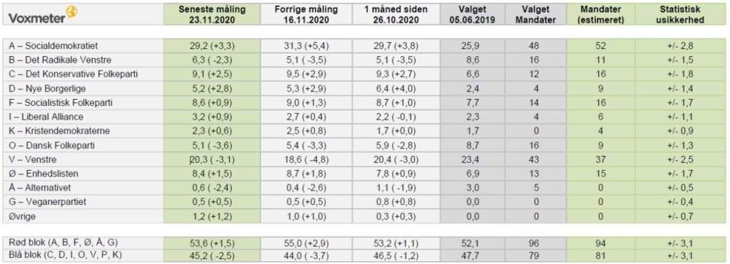 På bundlinjen står der 53,6% til Mette Frederiksens hold og 45,2% til de blå – en anelse dårligere for regeringen end i sidste uge, men i forhold til valget stadig en pæn fremgang, hvorimod blå blok står til en tilbagegang på 2,5% i forhold til folketingsvalget.