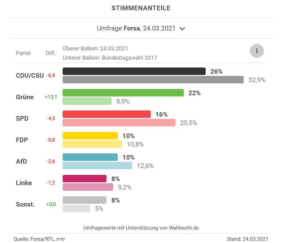I næsten hele det år, pandemien har raset, har CDU/CSU i meningsmålingerne ligget på op mod 40 % af stemmerne mod de 32,9 %, de fik ved forbundsdagsvalget i 2017. Men nu er de på rekordtid raslet ned på 26-28 %. Årsagerne er skandaler inden for partiet, hvor konservative parlamentsmedlemmer har benyttet deres mandat til at tjene penge på salg af masker, en stadigt mere slingrende end sikker kurs i kampen mod pandemien og senest en ydmygende retræte, da Merkel restløst måtte trække den forordnede “påskero” tilbage. Hele Tyskland skulle lukke og slukke i påsken, fra skærtorsdag til anden påskedag, for at undgå, at pandemiens tredje bølge kommer komplet ud af kontrol. Men der var gjort regning uden vært, for hvordan kan man fx konvertere skærtorsdag, der i Tyskland ikke er en helligdag, til en fridag uden at have styr på, hvem der betaler arbejderne for den ekstra fridag – eller betaler dem helligdagstillæg, hvis de alligevel arbejder?
