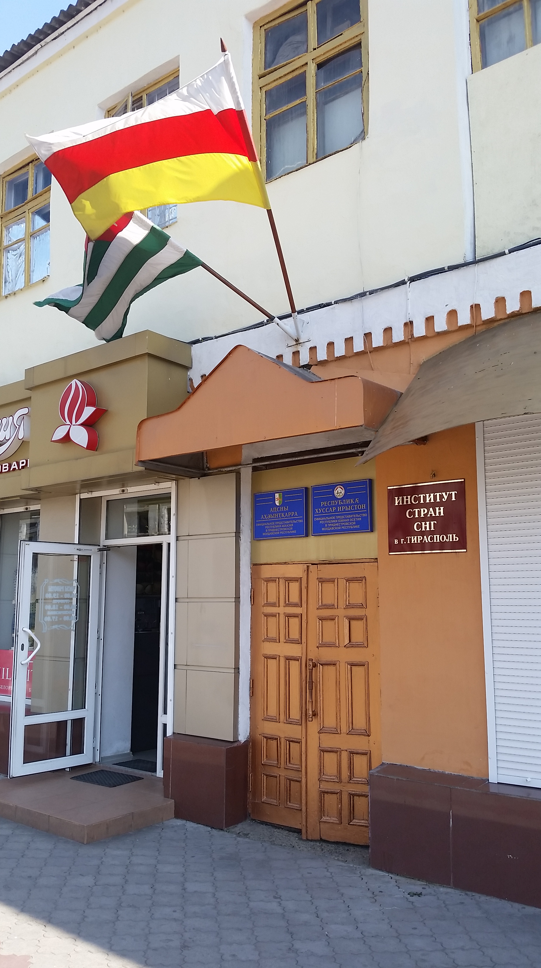 Området på den anden side af floden og grænsen kaldes enten Transnistrien (rumænsk for “på den anden side af Dniestr”) eller Pridnestrovie (Приднестровe – russisk for “før Dniestr”). Det er ikke et anerkendt land, og Transnistrien eksisterer udelukkende, fordi Rusland har indsat tropper, der forhindrer Moldova i at tage kontrol med området. De eneste diplomatiske repræsentationer i landet er fra andre russisk-støttede udbryder-republikker – billedet ovenfor er indgangen til Abkhaziens og Ossetiens ambassader i Transnistriens hovedstad Tiraspol.
