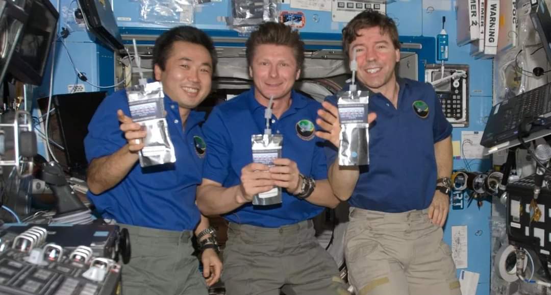 Blandt de dagligdags fornødenheder, astronauterne lige står og mangler, er blandt andet et nyt urinfilter, som omdanner astronauternes urin til drikkevand. På billedet skåler et tidligere ISS-team i det rensede produkt. Det er på mange måder grænseoverskridende at være astronaut.