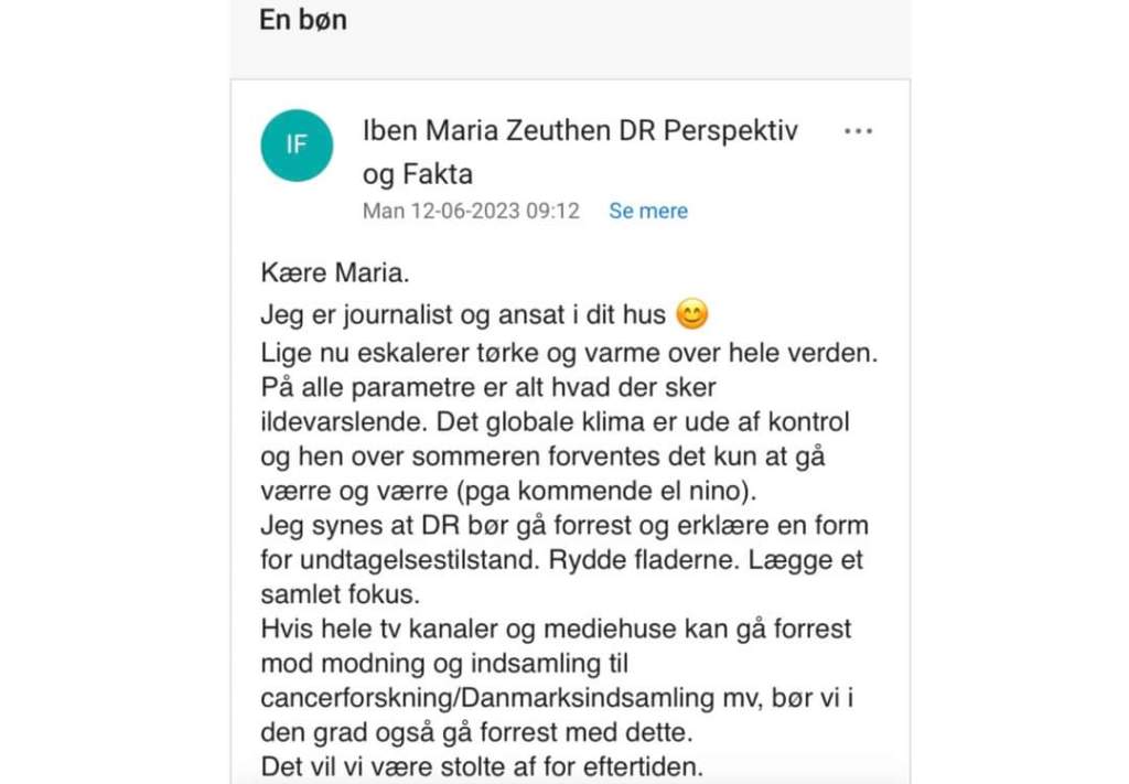 Følg Maria Iben Zeuthens opfordring. Vis din opbakning med et like og med at dele, så hendes livsnødvendige brev når så vidt ud som muligt, og en ordentlig, ansvarlig klimadækning bliver et folkekrav. Danmarks Radio er vores radio. Så bør den også tage vores liv alvorligt.
