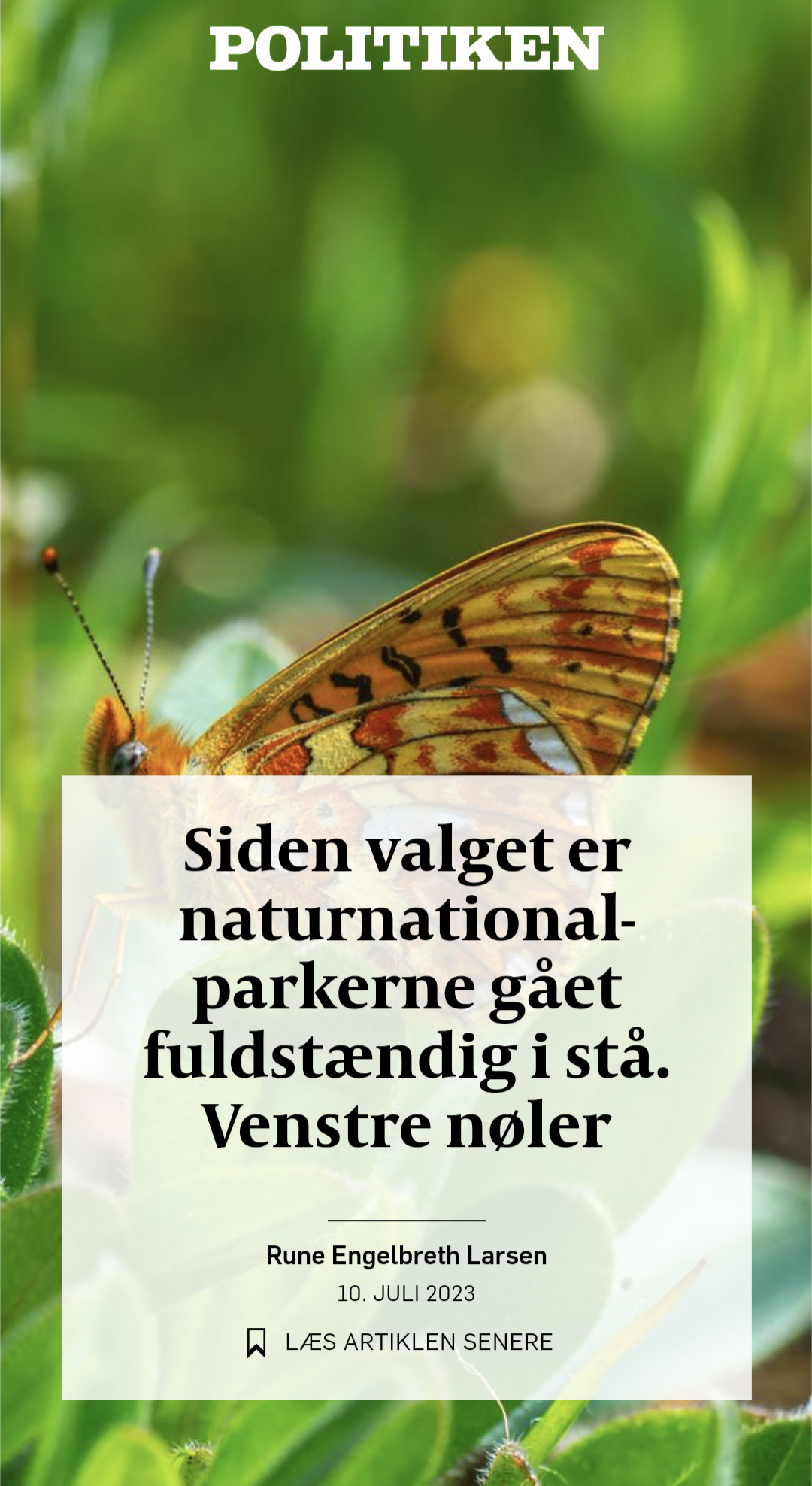 Rune Engelbreth Larsen klager i Politiken 10.7.23 over, at det ikke går hurtigt nok med etablering af de folketingsbesluttede naturnationalparker. Etableringen hæmmes ifølge Engelbreth af ”konspirationsteorier” fra dem, der ikke er enige med ham, og ”absurde anklager om dyrevelfærdsproblemer” fra dem, der har set dyrene dø af sult.