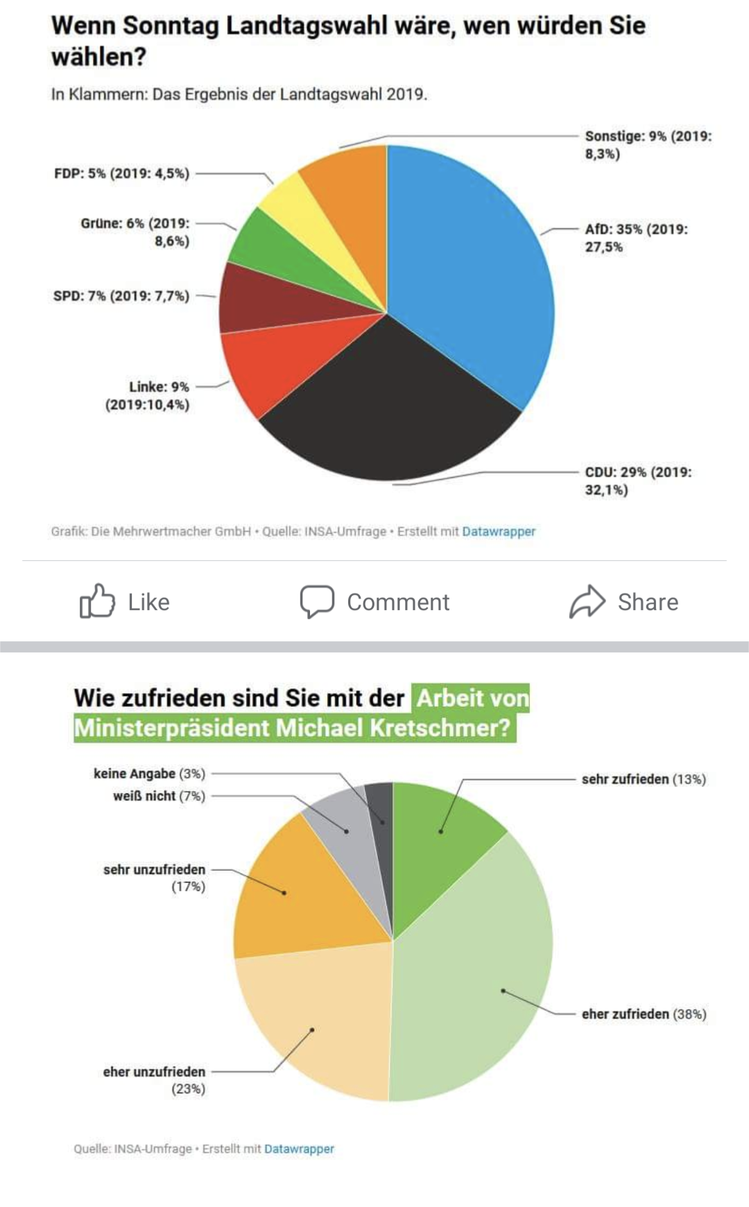Nu viser en dugfrisk opinionsundersøgelse, at AfD, hvis der var landdagsvalg på søndag, ville få suverænt flest af stemmerne: 35 %. Næstflest ville det konservative parti, den kristendemokratiske union, CDU få: 27,5 %. Siden det seneste landdagsvalg i 2019 har CDU ledet en koalitionsregering med juniorpartnerne Grüne og SPD. De to småpartier står i meningsmålingen til af få hhv. 6 og 7 %, akkurat over spærregrænsen på 5 %. At de overhovedet kommer i landdagen ved næste valg, nemlig om et år, er langt fra sikkert, da deres sikre stemmer ligger under grænsen. Under alle omstændigheder tyder intet på, at koalitionsregeringen vil kunne fortsætte efter næste landdagsvalg. I så fald skal CDU under ledelse af ministerpræsident Michael Kretschmer yderligere forhandle med lige så diminutive, men profilhungrende partier som det liberale FDP og det socialistiske Linke. Eneste alternativ er et tabubrud i form af et regeringssamarbejde med AfD.