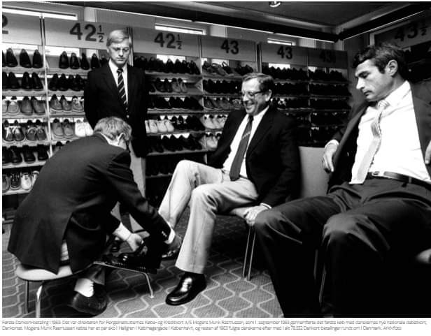 Mogens Munk Rasmussen blev fyret og afsat som formand for DR i 2008, og jeg havde lejlighed til at spørge ham om ikke tiden i DR var det værste, han havde oplevet i sin karriere. ”Nej”, sagde han, med sit velkendte faste blik bag brillen, og mindede mig om at det var ham, der som direktør for Pengeinstitutternes kortselskab PKK fra 1981-85 var ansvarlig for indførelsen af Dankortet. I avisklippet her betaler han (th.), som den første dansker, et par sko med Danmarks første Dankort, hos Hallgreens i Købmagergade i København. Han troede han gjorde os en tjeneste. Men blev mødt med årtiets største shitstorm.