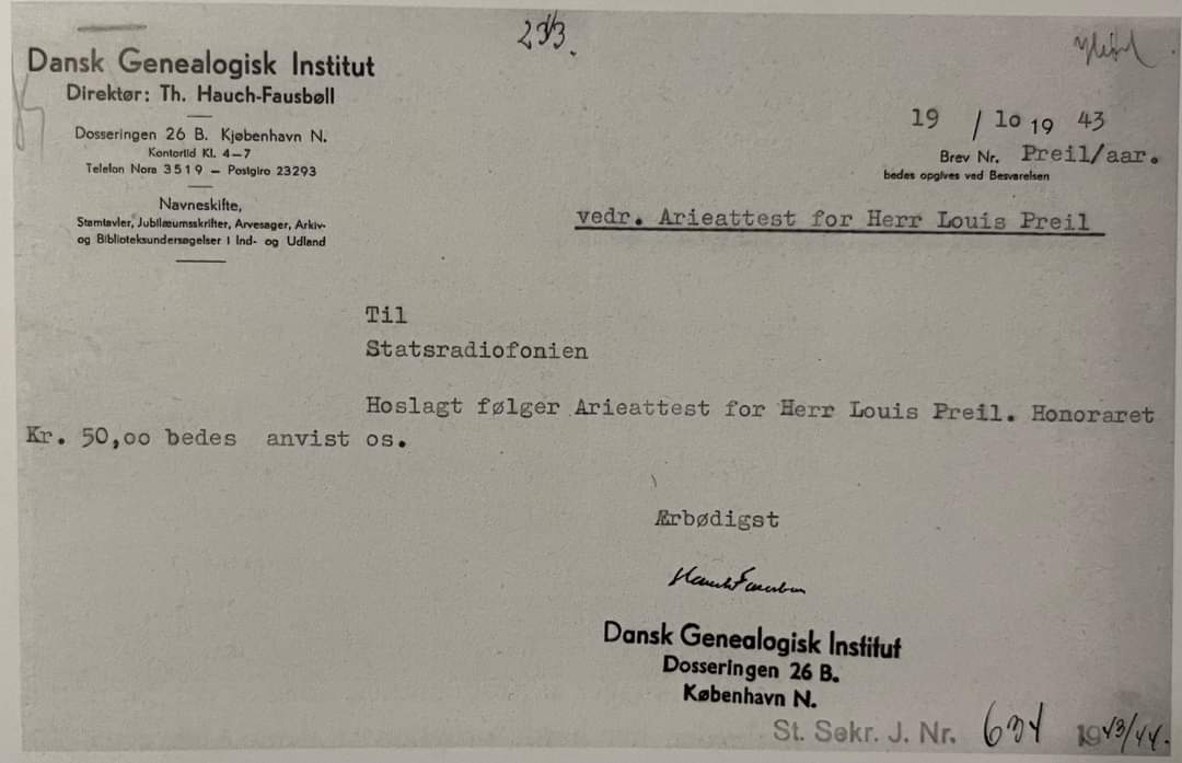 Det virker vanvittigt i nutiden, men i 1943 kunne man faktisk, formedelst 50 kroner, få en sådan attest udarbejdet af ”Dansk Genealogisk Institut”, beliggende på Dosseringen 26B i København. På billedet ses violinisten Louis Preils arieattest, udformet og underskrevet af direktør Th. Hauch-Fausbøll.