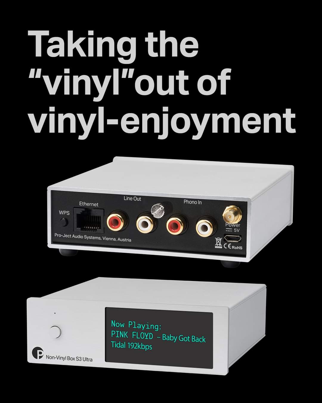 Pro-Ject NON Vinyl Box S3 Ultra analyserer phono-inputmusikken og matcher sangen med internetdatabanker. Den matchende rene digitale fil konverteres med den indbyggede DAC og føres ind i din forstærker gennem RCA-stikkene.