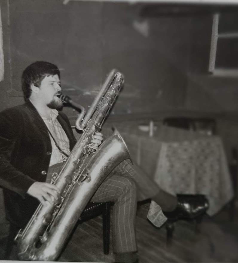 Der er ikke mange, der ved, at jeg på et tidspunkt legede med en bassaxofon, Da jeg kom med Papa Bue 1966 spurgte Arne Bue, om jeg ikke havde lyst til at at lære nogle få numre på tuba, da dette instrument var meget populært i Tyskland, hvor bandet turnérede meget. Jeg var ikke interesseret i at spille på tuba. Derimod har jeg altid været fascineret af bassaxofonisten Adrian Rollini, der spillede “basinstrument” med bl.a. Bix Beiderbecke i 1920erne. En skøn musiker med en vidunderlig tone og fantasi på dette instrument. Vores trompetist, Finn Otto Hansen, var begejstret for Bix Beiderbecke, og det ville passe fint, hvis jeg spillede på bassaxofon i nogle beiderbecke numre.