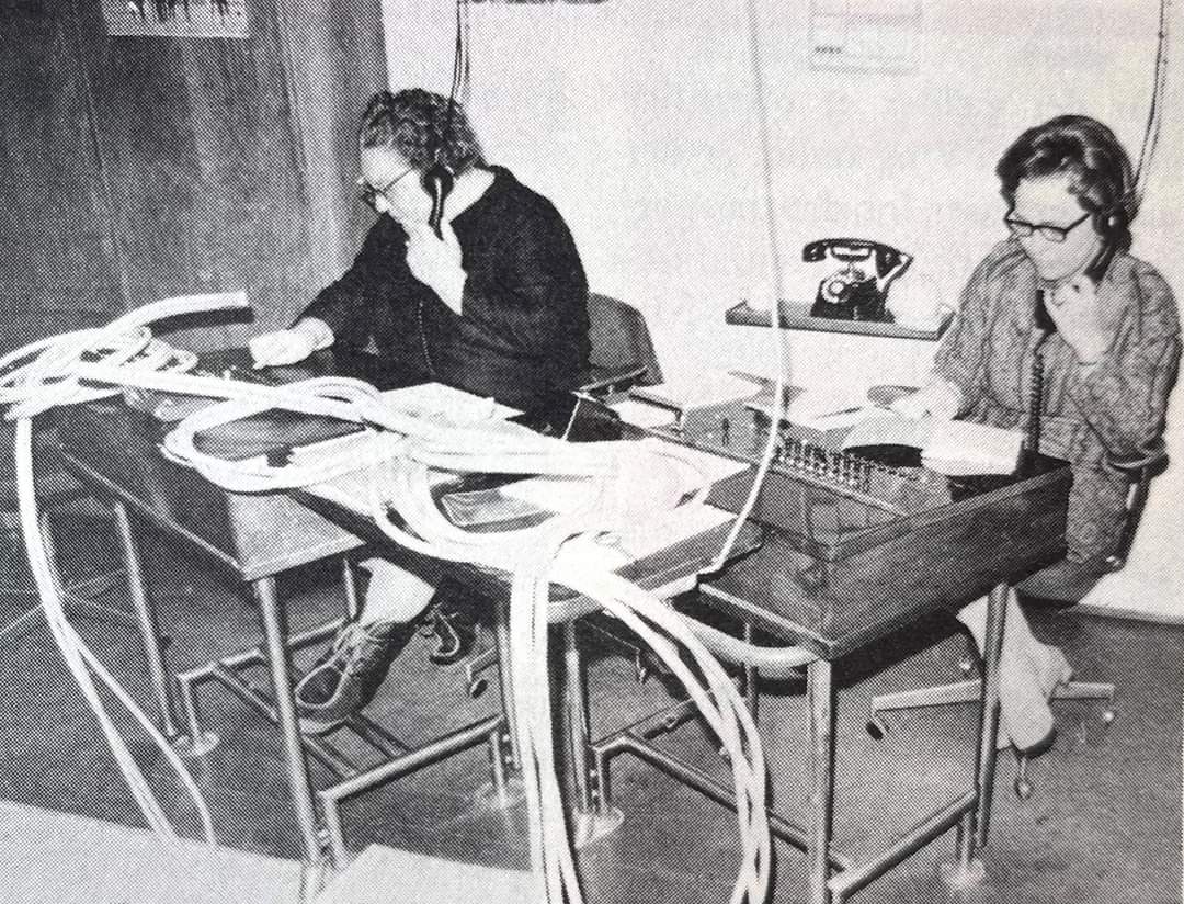 På billedet ses telefondamerne Ruth Weber og Vera Pedersen, som måtte lægge ører og ledninger til tidens telefonstorme…