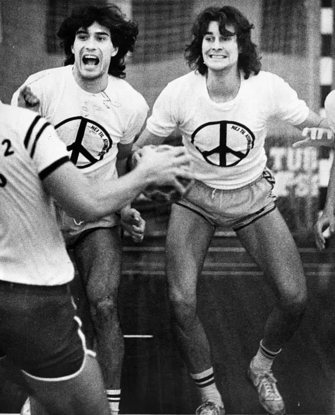 Carsten Haurum og hans holdkolleger Per Skaarup og Morten Stig Christensen (foto) medgav at politik og OL ikke kunne skilles ad. Men deres svar var, at hvis politikerne blandede sig i OL måtte OL-deltagerne vel også blande sig i politik. Derfor iklædte de sig i Los Angeles i 1984 trøjer med “Nej Til Atomvåben” og ”Idræt for Fred” på fem forskellige sprog. Samtidig klæbede de mærkater med hvide duer på deres id-kort. Gad vide om det var gået i dag, hvor det opfattes som politisk ukorrekt at opfordre til fredsforhandlinger i f.eks. Ukraine og Gaza…?